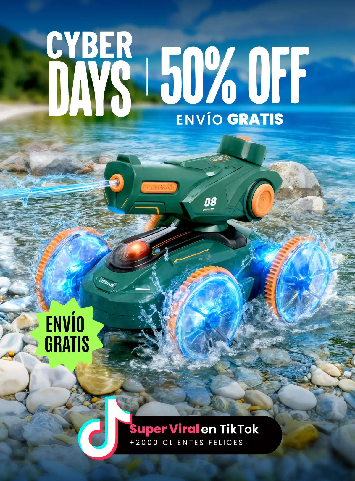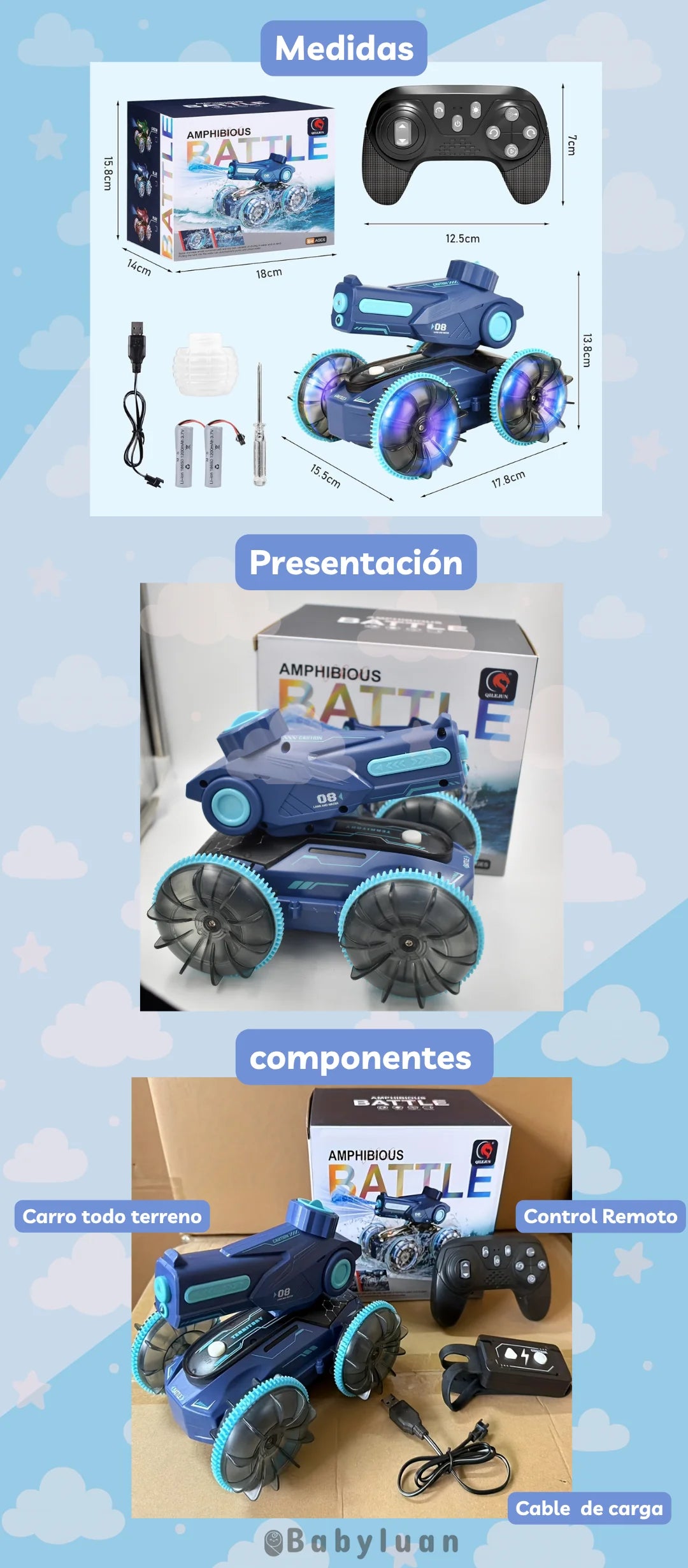 Con luces LED, tracción total y chorros de agua, este carro anfibio convierte cualquier terreno en pura diversión.